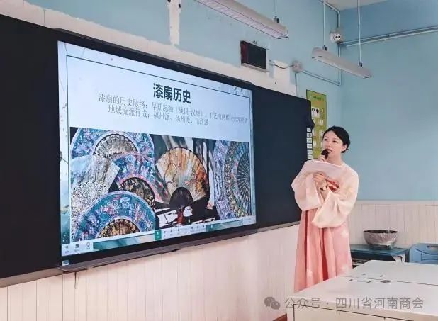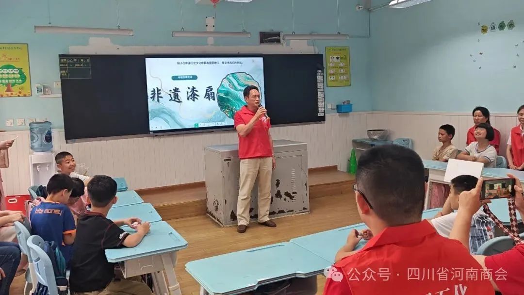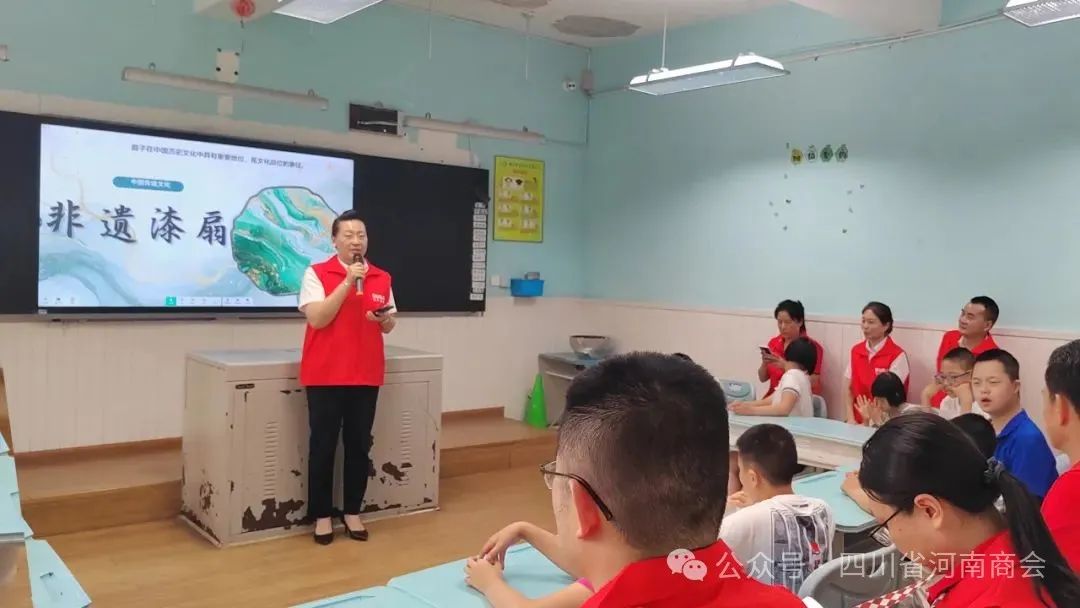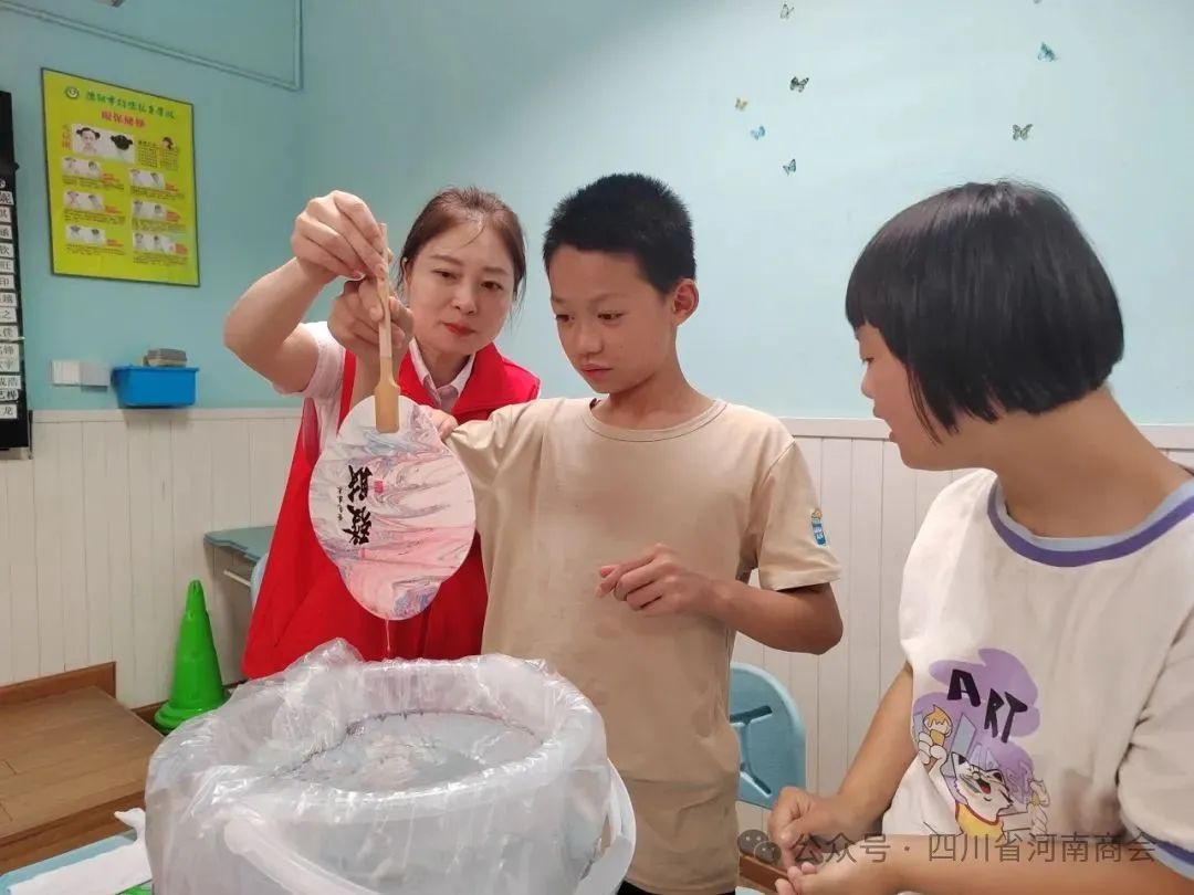 “一笔一漆绘童真。”“漆彩童年”环节,孩子们在党员志愿者指导下制作漆扇。身着唐装的非遗传承人讲述扇文化,从汉代“便面”到明清雅趣。五彩扇面晕染童真梦想,传统漆艺与创意交织,成为文化传承的生动注脚。
