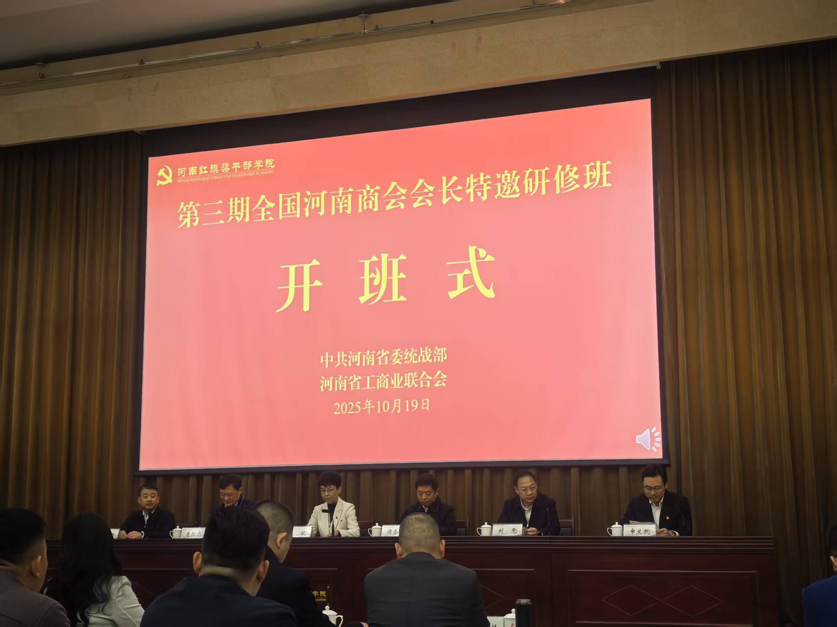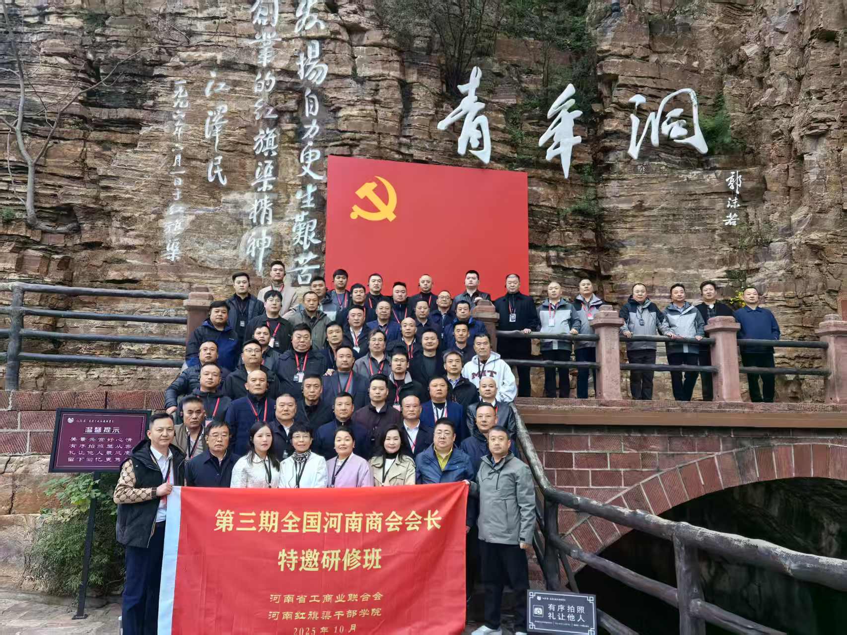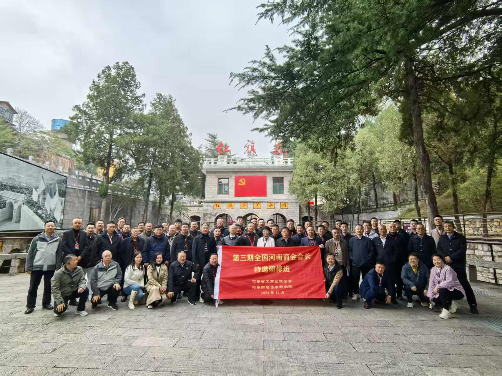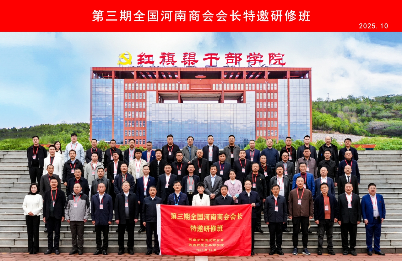 2025年10月19日,第三期全国河南商会会长特邀研修班在河南红旗渠干部学院正式开班。此次研修班由河南省委统战部、河南省工商业联合会主办,旨在深入学习贯彻习近平新时代中国特色社会主义思想,弘扬红旗渠精神,推动商会改革发展,促进全国各地豫商交流合作。来自全国各省级河南商会的会长及常务副会长等共60人参加了本次研修班,我会党委委员、轮值会长秦海江,党委委员、常务副会长杨大亮参加培训。