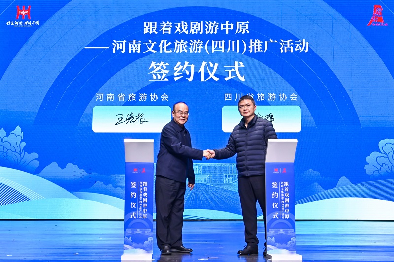 12月16日晚,由河南省文化和旅游厅、安阳市人民政府主办,安阳市文化广电体育旅游局承办的“跟着戏剧游中原——河南文化旅游(四川)推介活动”,在位于成都市成华区龙湖滨江天街的成都国际剧院盛大启幕。河南省文化和旅游厅、四川省文化和旅游厅等有关领导出席活动并致辞,河南省旅游协会和四川省旅游协会签订了战略合作协议。我会协助承办了此次活动。常务副会长张社林、杨大亮、胥露阳,副会长李超、李建和理事、会员及省级异地商会代表300多人出席活动。