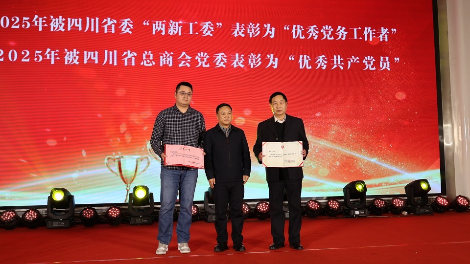 四川省工商联党组成员、副主席杜君良为2025年度被中共四川省委“两新工委”表彰为“优秀党务工作者”的陈京生、被四川省总商会党委表彰为“优秀共产党员”的时保峰颁发荣誉证书。